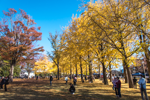 昼間は秋晴れの真っ青な空のブルーを背景に、夜は暗闇をバックに黄金色に輝くイチョウの葉。