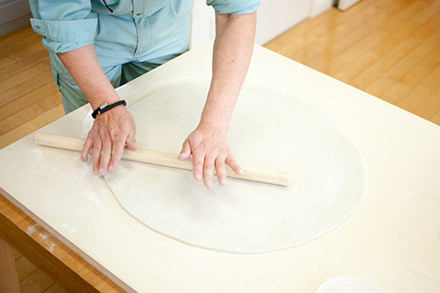 今回は打つそばの量が結構多いので、広いスペースを確保するため2本の延し棒でクリップしながら打つという工夫が必要でした。
