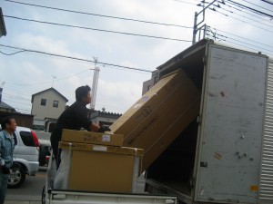 お店に届いたエコキュートです。荷物運んでくれた運送屋さんに