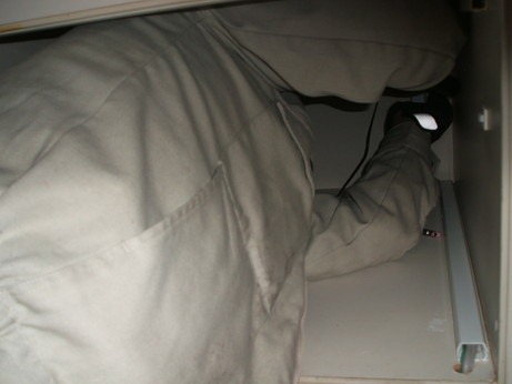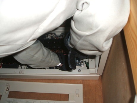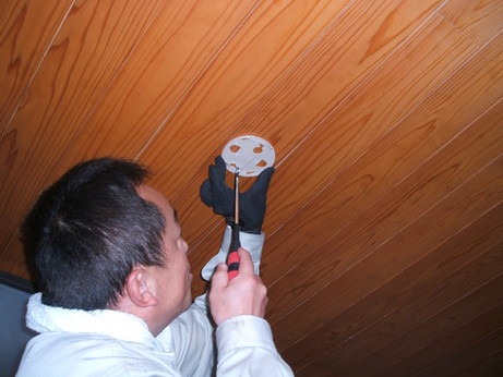 分電盤の後ろにユニットバスがありましたので、その点検口からいったん電線を天井にひっぱり、床に落として目標の場所まで床下をもぐって電線をもって行きます!