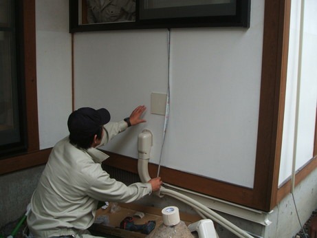 ↑床下をもぐって、外に取り出したエアコン用の電線です。すでに開いていた穴を利用しました。