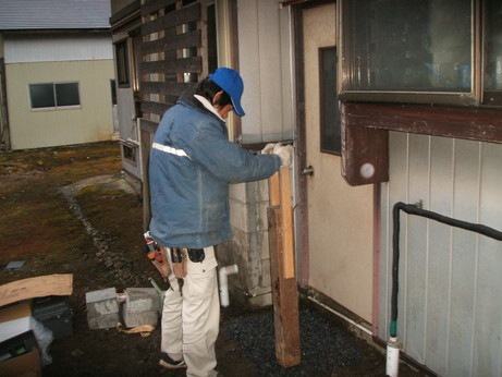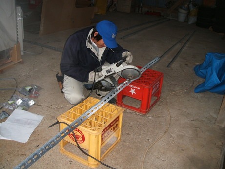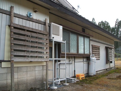 ↑ヒートポンプを載せる架台を作成しているところです。雪がかからないよう高さをとるためにオリジナルオーダーメイドで作成しました。
