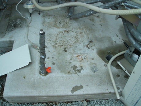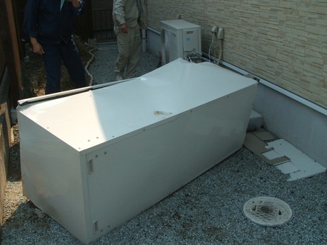 ↑東日本大震災の地震により、エコキュートが完全に転倒しておりました。本体脚部を固定していたアンカーボルトが、根元から完全に折れていました。