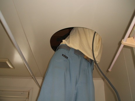 実は近くに分電盤があり、IHクッキングヒーターまでの電線を出来るだけ隠蔽して配線しようとお風呂の点検口の上を配線しているところです☆