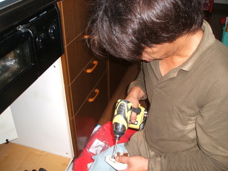 ↑システムキッチンのコンロの下扉を開けて、IHクッキングヒーター用のコンセントを取り付けます。
