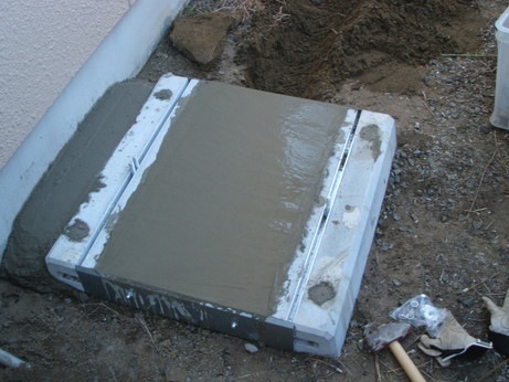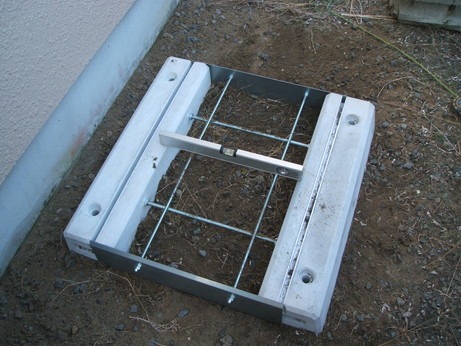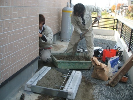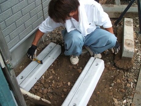 ↑エコキュートのタンクの基礎コンクリートを作成していきます。寸法及び水平に注意して作成していきます。四方に地中抵抗アンカーを地中深く打ち込み、無収縮モルタル材を流し込んで基礎の強度を十分にします。