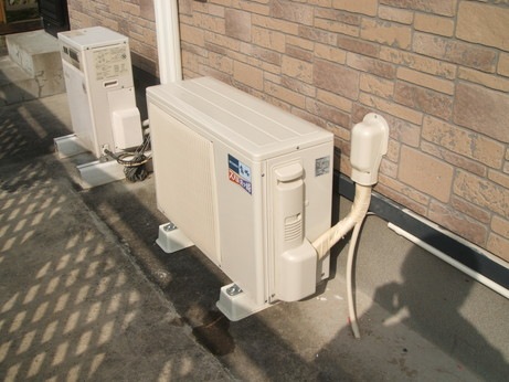 ↑高性能エアコンを設置していきます。今回は床置き型のエアコンです。暖房能力が高いので、あったかいですよ!