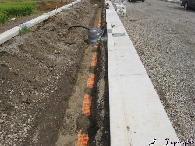 このように、電線管を地中に埋設して埋設シートと言うシートを布設して埋め戻します。先のほうに見えるのがスパイラルです。
