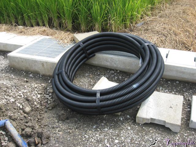 これは、照明灯の電線を通す埋設用の電線管です。 これを60CM位地中に埋めます。今回はこれを片側約150Mくらい埋めます。