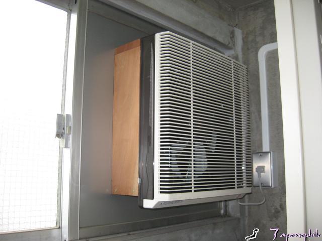 窓は開かなくなりますが壁の開口をしないでとりつけられます。この現場も鉄筋コンクリートの建物でこのクラスの換気扇枠の壁開口は、実質無理でしたので窓の部分を利用しました。