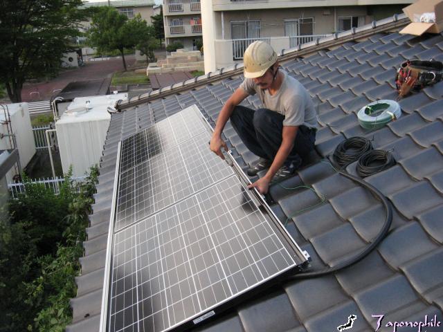 さてきょうは、朝から太陽光発電には最高の日差しの中、シュウくんと太陽光設置の続きをしました。パネルをのせて配線です。あとは固定してこの面は、終了です。 つぎは、 南面!! とおもったら・・・・・