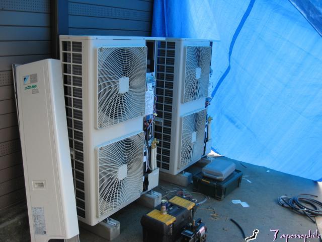 室外機は隣の機器と比べるとわかりますが、大き目です。暖房能力が良いエアコンは普通のエアコンより大きいです。