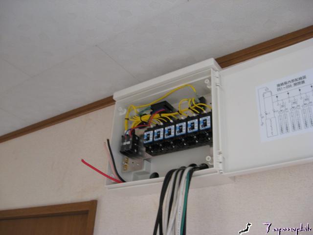 右側はコンディショナー(直流の電気を交流に変える)で分電盤の隣に設置しました。