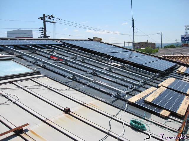 パネルをのせて、あとは配線をして集電盤・コンディショナー・売電メーターの設置等を済ませて終了です。