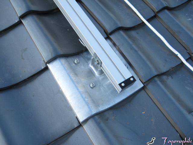 今回は、瓦タイプの金具を使用します。アルミ製の瓦と同じ形をした金具を瓦と交換して屋根に固定します。