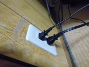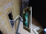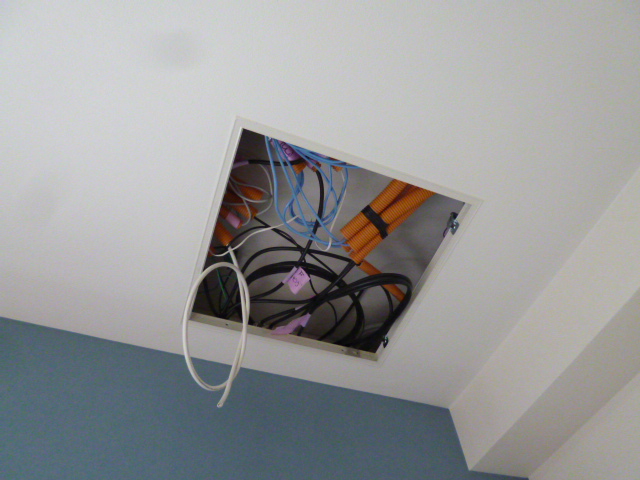 お客様もどのようにして配線するのか興味津々な様です。エアコン取り付けた部屋から配電盤までは家の敷地の端から端です。2部屋渡りオマケに真ん中に玄関と階段があって部屋を仕切ってます。まずエアコンの上の部屋の畳上げ床板を丸鋸で切断、床を開口します。勿論後蓋して床動かぬよう梁の真ん中を切断します。今度は配電盤の上の部屋も畳部屋ですので、配電盤に近い箇所の床も開口します。こちらの天井裏に作業灯を置き、片方の開方向から明かりが見えるか確認します。かなり距離ありますが明かりが見えました。片方からケーブルフィシャー伸ばし、明かりめがけて伸ばし、開口部からケーブルフィシャの先つかめれば、これにVAケーブル巻きつけ、手繰り寄せます。次にエアコン側から入れたVAと配電盤側から入れたVAを引き寄せ、2箇所をコネクターで接続して配線完了、床を閉め釘打って掃除して、畳を載せれば天井裏の配線は終了です。
