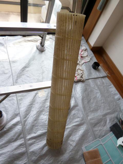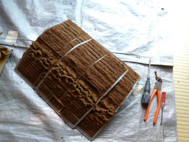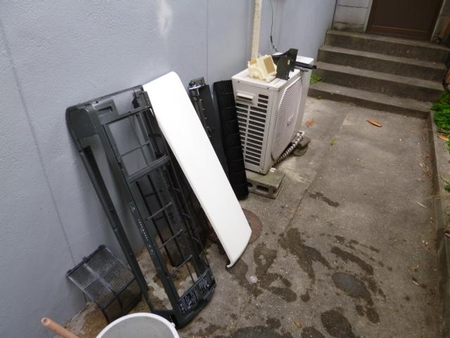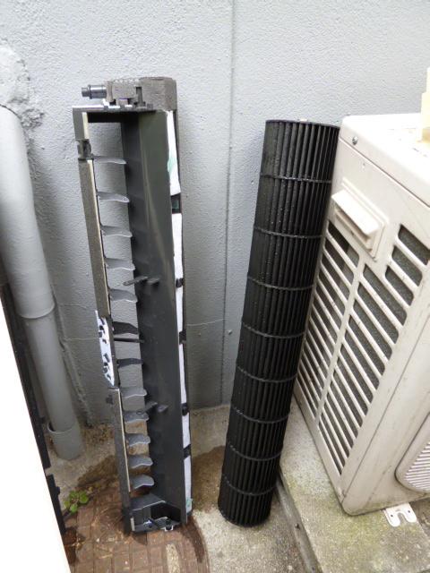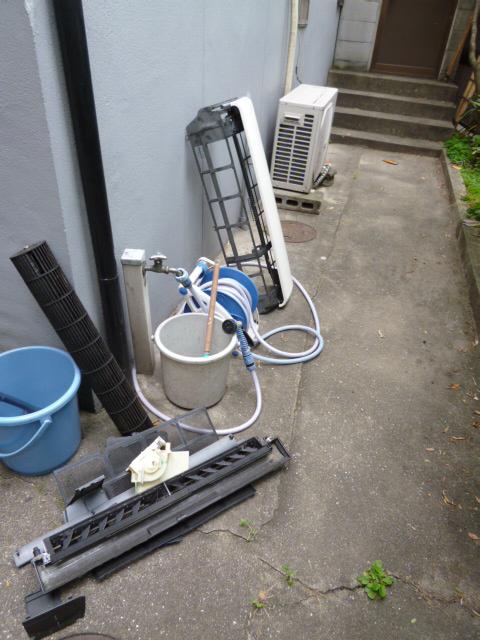 分解して、電装部品取り外し、洗浄パーツに部類わけするまでは、従来の作業です。後に、本体はベースパネル、エバ【エバポレータ】だけ残し洗浄液と水で、ビニール袋受け手洗浄しておきます。乾燥の間に、表で洗浄可能部品を、洗剤かけながらおもいっきりざぶざぶ洗い、塩素系洗剤が残らないよう十分流水で流します。後今日は天気いいので天日干ししておきます。今回は上下に稼動する部分がありますのでグリス部も洗い流し乾燥してから再度塗り直します。