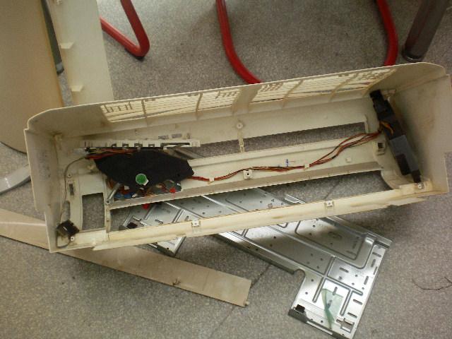 今回のエアコンは移設のために取り外したエアコンです。お客様リビングに新規にエアコン導入時取り外した機器を、別の場所に移設します。今回の機器はお掃除機能は無いものの給排気の換気機能、付です。電装もかなり多いですが、分解は慣れたサンヨーのため楽です。