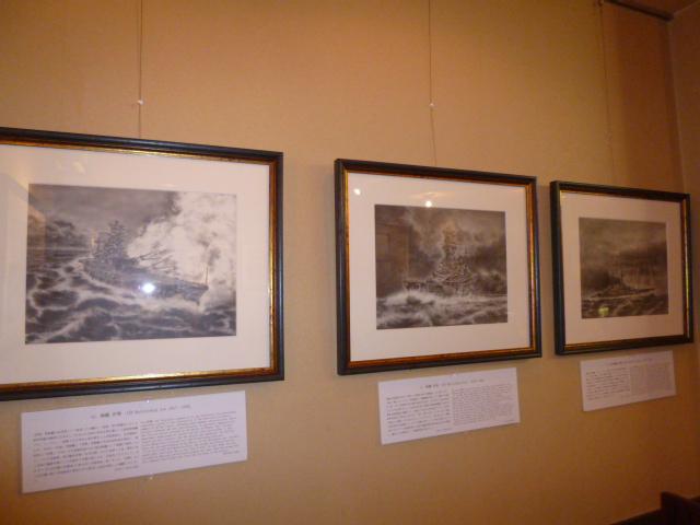 午後からは大阪心斎橋で、息子の友人の方が絵の個展を開催されてるのを訪問します。なぜ絵かと言うとテーマが私好み、歴代の日本の海軍の軍艦を資料のみでイメージし鉛筆のみで書きあげてると言うもの、イメージのみでここまで書き込めるかと溜息ものです。空の雲、掻きわける波とあれる海、煙突の煙、大砲の排煙、など躍動を感じる絵画です。