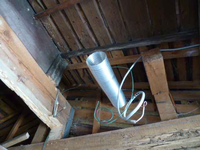 スタッフブログ 2013年5月17日本日、浴室、台所リフォーム始まってます、N様宅に浴室のバス乾(浴室暖房、乾燥機)の電源工事を行いに行ってまいりました。事前に配電盤近くに点検口、の開口をお願いしておきました・・・が見事に横梁にヒット首突っ込めません。手鏡で周辺見渡し、VA線配線くぐらせる箇所探ります。幸いかな屋根の入りこみ部に隙間発見、どうにか配電盤まで⒈回路引けました。後、リモコンとアースとって一段落、その後大工さんにエコキュートの風呂リモコンのコード延長と電灯のVA線の延長頼まれこれも済ませて来ました。