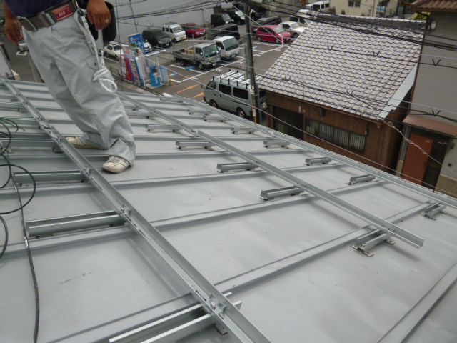 さすがです。最初一番、安全点呼をチームで行い、さぁっ!工事開始、最初は10名で2件1日で完了するのかな と思ってましたが、各チームの連携がスムーズなのか・・・・皆若いのか、皆さんいま自分が何すべきなのか、他のものが行ってる作業とかぶらないようにお互いの連携が出来上がってるようです。電気周りする2人はそれに集中し、パネル取り付けにかかる人員が他に回ります。