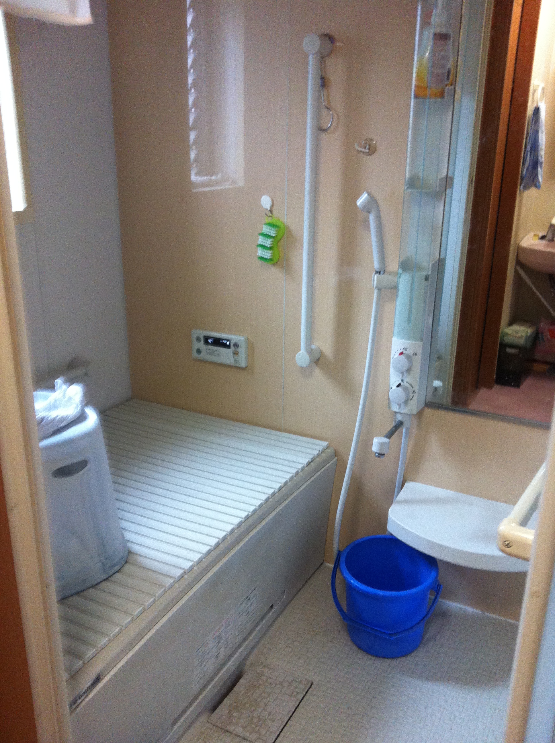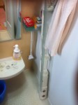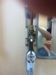 スタッフブログ 2013年5月29日本日は、水道屋さんです。ユニットバスのシャワーの温度が中々上がらずなぜかな??と言うことで他の給湯箇所には正常にお湯が出てることから、カラン内部のサーモの不良と判断、メーカ調べ部品手配してさぁ交換となりました・・・・が、経年変化でロックナットが回りません。ここであせって無理やり回すとカラン本体壊す恐れあるので、ナット部にCRC(潤滑剤)吹っかけてしばし我慢!!その間カラン全体見渡しにくいので縦の収納部バラして見ます。プラのカバー持っては踏ん張れ無いので力架けられません