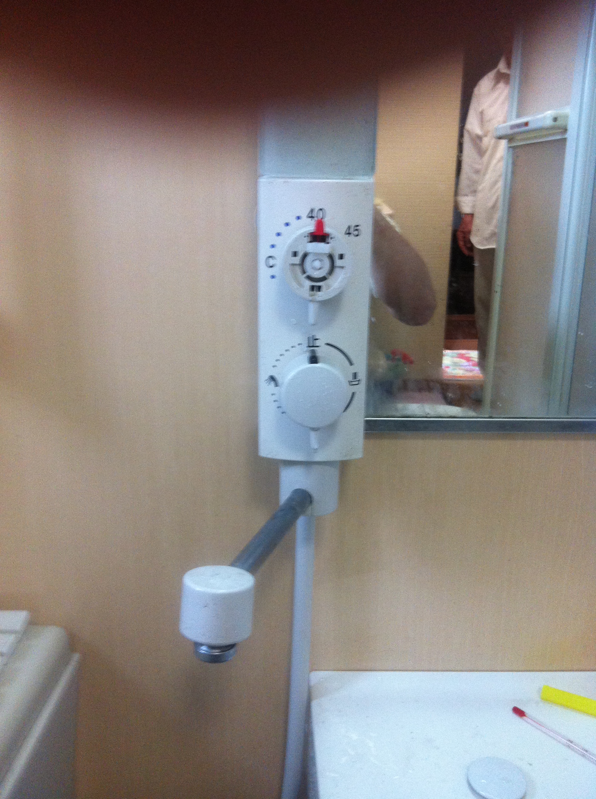 カバー外してカラン本体持てばCRCの効果もあり、軽く回り外れました。サーモ交換して、カバーを元の通りに組み立て、さらに温度ダイヤルの調整です。給湯機から来てる湯温が40度ですのでいっぱい回しても40度以上にはなりませんので、温度計で湯温測りながら調整します。若干高めに設定しました。