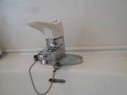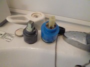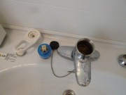 本日は、洗面ユニット内の水柱のハンドルの動きが固いとのことで水柱のアダプターの交換です。ユニットしたの止水栓を、水、湯とも閉めて水栓バラします。ハンドルとって止めナッド緩めアダプター交換です。以前のと比べえらく小型に成ってます。