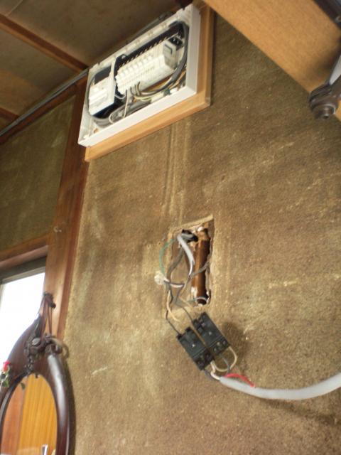 旧ブレーカーボックスの部分をメクラプレートで塞ぎ、配線は壁の中に隠蔽して、新配電盤に引っ張りこみました。この工事中は、仮設の電源をメータからとって作業しました。アースも取って置きます。