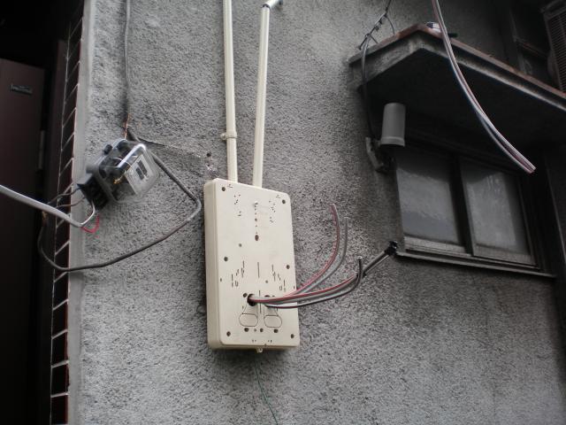 いずれオール電化のことも考えての容量アップ工事です。出来れば屋内の配線もといいたいところですが、建物が古い事とお客様の都合により後と言うことで、配電盤を漏電付主幹と回路の数アップ、屋外は耐候型メータに仕様変更のため、計器ボックスは取りつけず、プラの配盤のみです画像では引き込み工事来るまでの仮設で現在のメータは耐候型で無いため旧ボックスを取り付けてます。