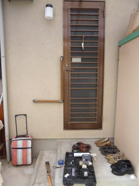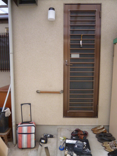 電気屋さんとは全くちがう仕事です。掃除機配達行ったときに、勝手口に手すりつけて欲しいとの依頼です。出入りは格段ここからの方が多く、段が高いので確かに手すりあったほうがいいのは判ります。