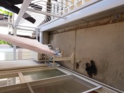 日曜日で定休日したが、応援の方がこの日しか日程が取れず 早朝から開始しました。基礎のコンクリートも充分に乾き、難所は機器のフェンス越しです。もう一人搬入応援の方お願いし、フェンス越しに簡易の足場を組みます。梱包のままフェンス上に毛布引いて隣の駐車場から搬入します。隣の駐車スペースもここに駐車されてる方が当方のチェーンの事務局長さんですので当日車、移動して頂けました。