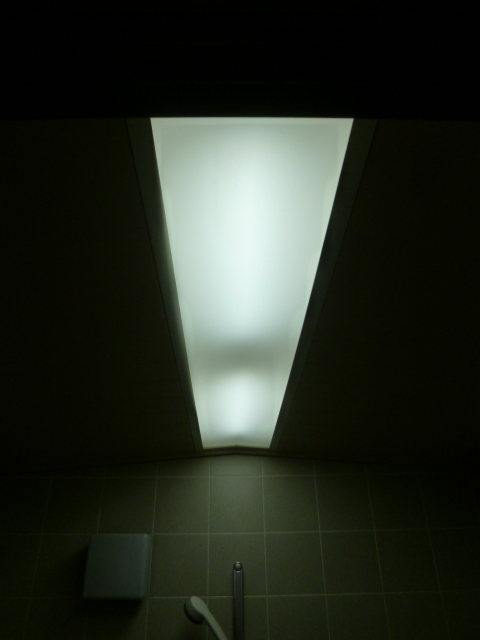 2014年2月4日 スタッフブログ昨日は 浴室の埋め込み蛍光灯照明をLEDに交換しました。現行は20Wx1灯器具が直列に2台の合計40Wのものをお客様が暗いのが嫌い、昼間みたいに明るいのにしてという事でLED40W相当x2灯に増設しました。UB(ユニットバス)天井が堀天井に成ってますのでこの中にLED40Wx2灯防湿、防雨の器具に交換しました。