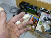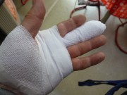 血跡で物件を汚しては大変。中止して指の根元止血したら出欠止まりました。止まったのをいい事に 残りの雑用、片付けて帰りに隣の病院に。医者になぜすぐ来なかったと怒られ、5針縫われました。もはや救急絆創膏で済ませられる状態ではなく、オマケに止血処理が間違ってると痛く怒られ、包帯ぐるぐる巻き状態です。今後の仕事に差し支えあるなと思ってたら・・・・・顔、手さえ洗えず。片手しか使えないのがこれほど不便なものかと痛感です。
