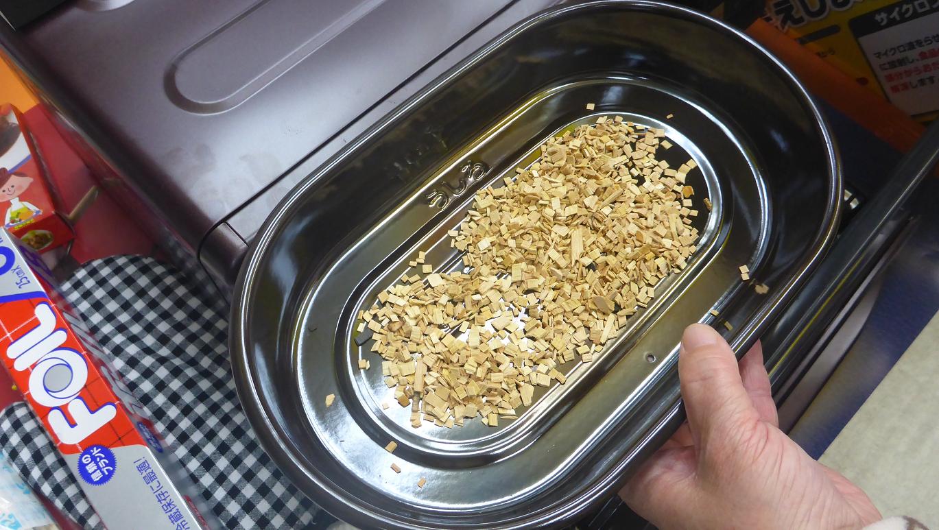 ①くんせい容器のだ円のラインの内側にまんべんなく燻製チップを広げます。