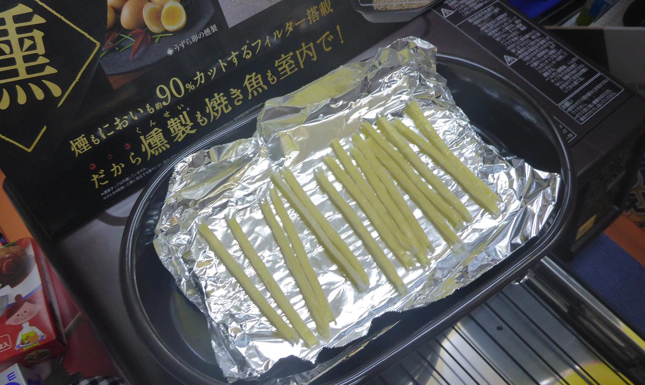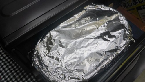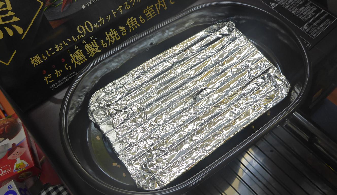 ②くんせい網にアルミ箔を巻いてくんせい容器の中に置く。