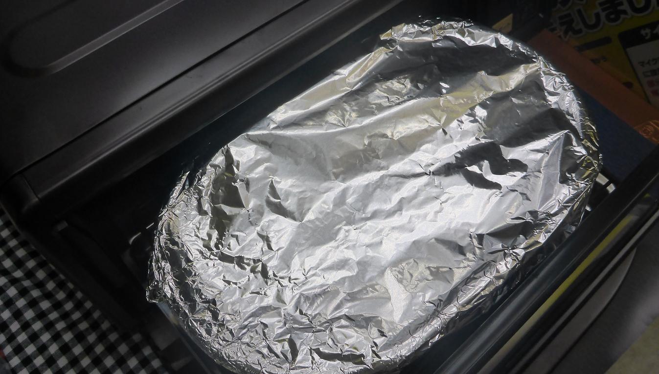 ④アルミ箔をくんせい容器のうえにかぶせてふたをし、くんせい容器のふちに沿ってしっかり巻き込んで、すき間ができないよう密着させる。