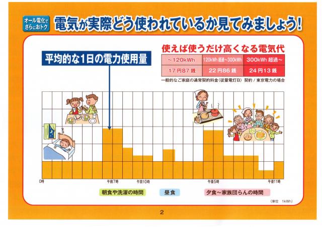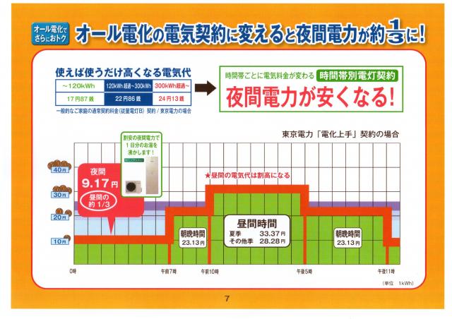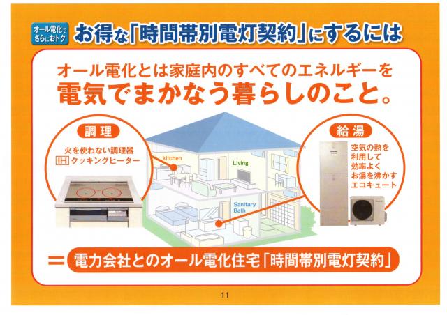 このように、給湯をエコキュートに、ガスコンロを200VIHクッキングヒーターに替えていただくと、時間帯ごとに電気料金が変わる「時間帯電灯契約」に変更できます。
