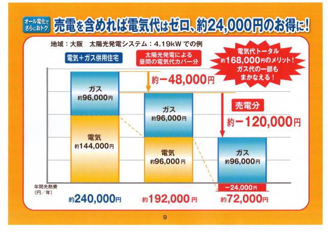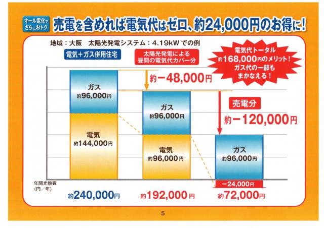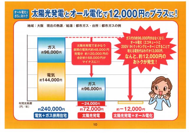 太陽光発電によって、年間72,000円になっていた光熱費にこの13,000円をプラスした85,000円になりますが全て電化されますので使わなくなったガス代約96,000円が全部マイナスになります。