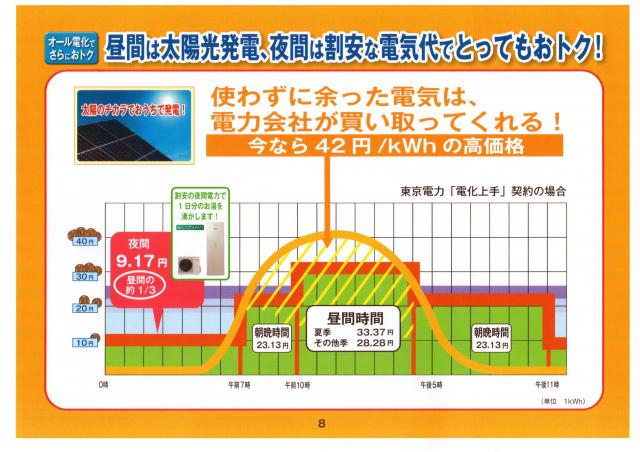 太陽光発電で、昼間の電気がカバーでき、余った電気は売れる、その上買わなければいけない夜間の電気代は、通常の電気代の約1/3割安。
