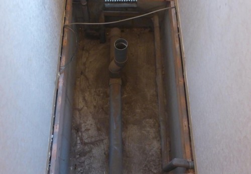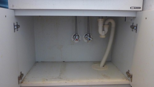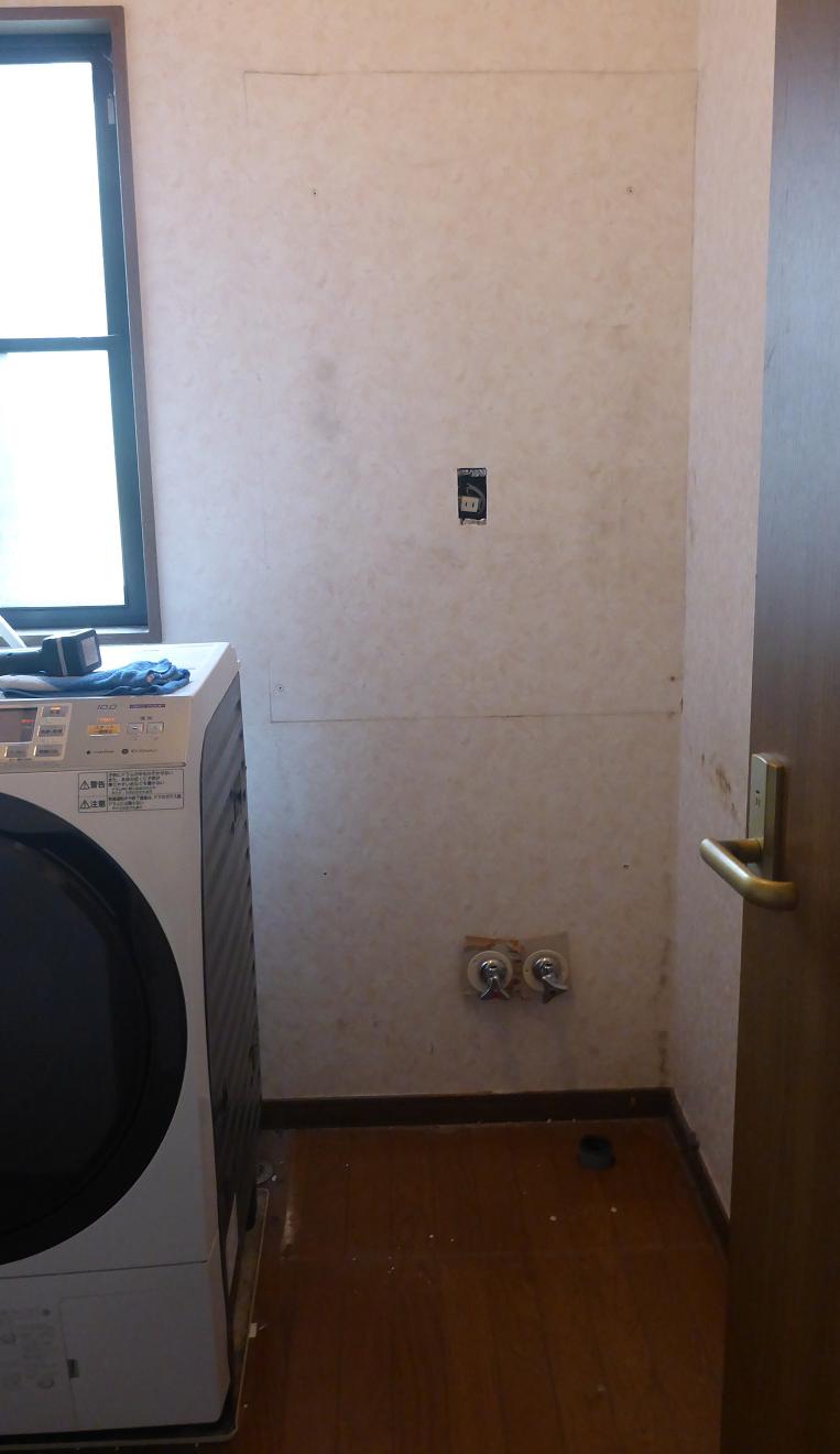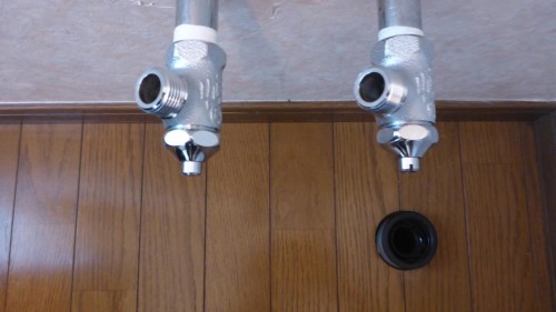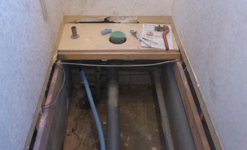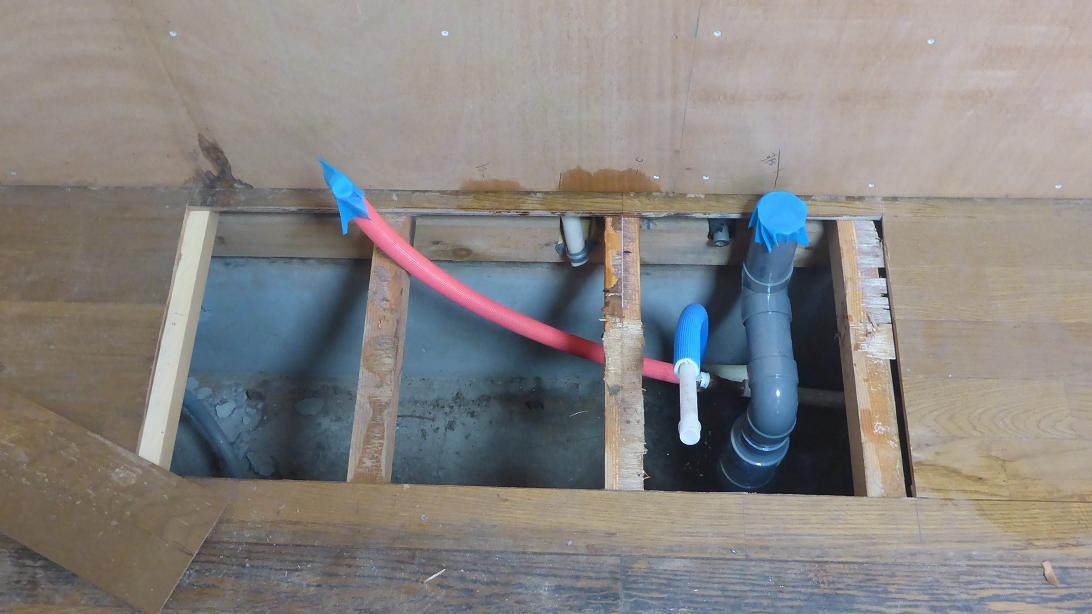 手洗いは壁に設置します。(青い配管が手洗いの給水管です)