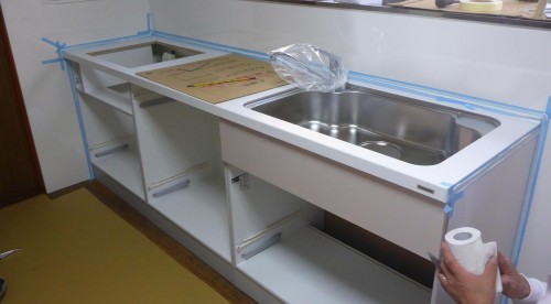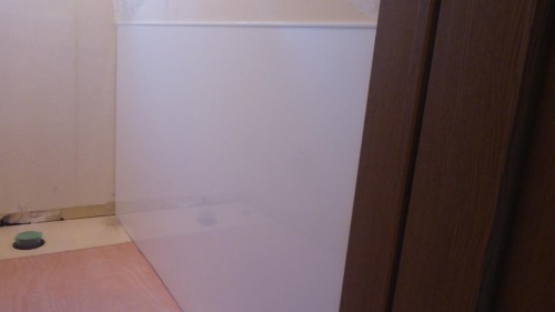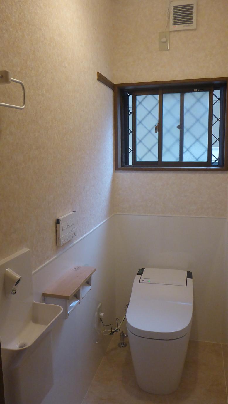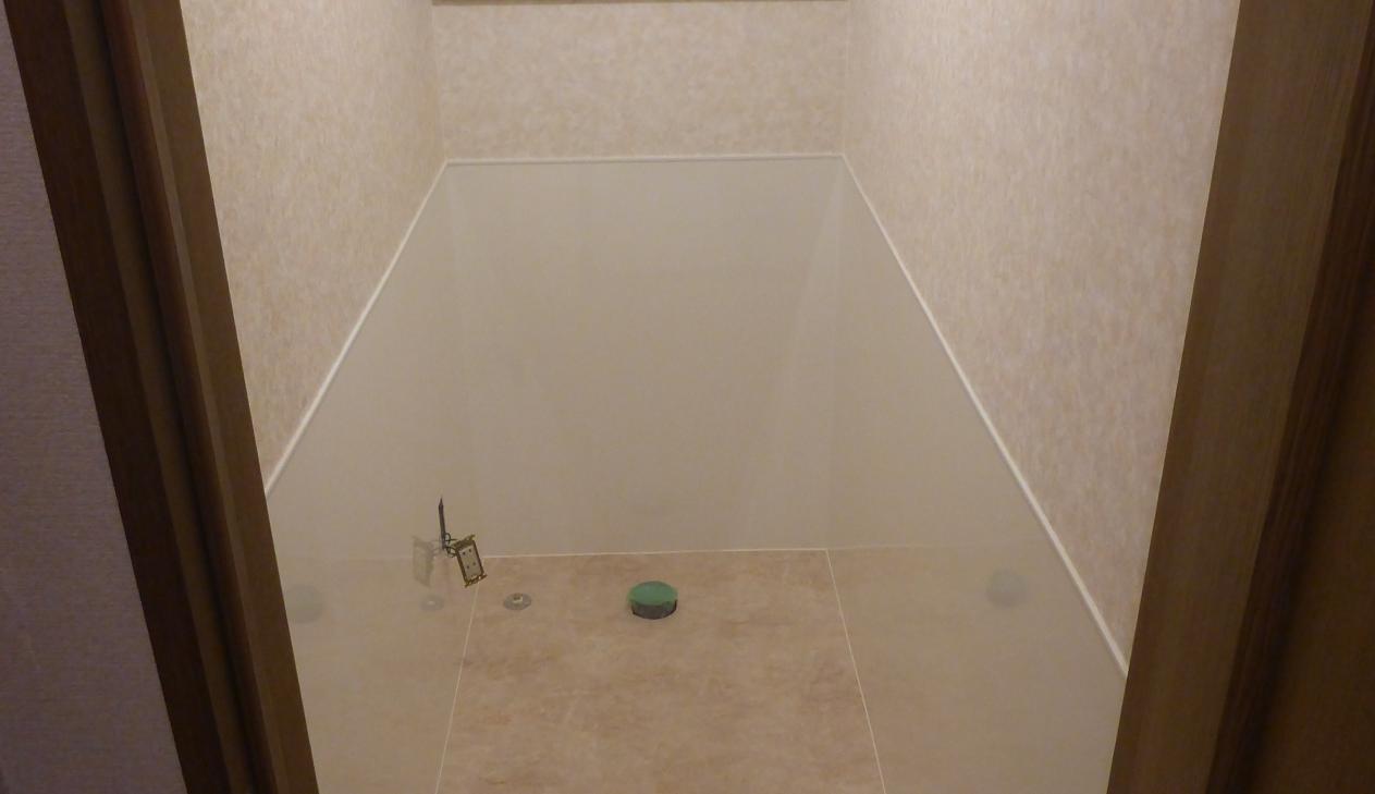 続いて、壁にクロスを貼ります。通常はトイレ用の壁紙を張るのですが、今回はとにかくお掃除をラクチンにしたいと奥様から要望を受けてましたので、腰高までキッチンで使うキッチンボードを採用しました。