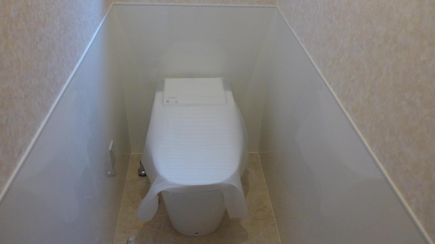 コンセントやアース配線、止水栓工事をし便器本体を取り付け・・・