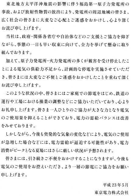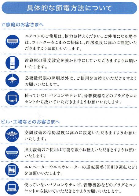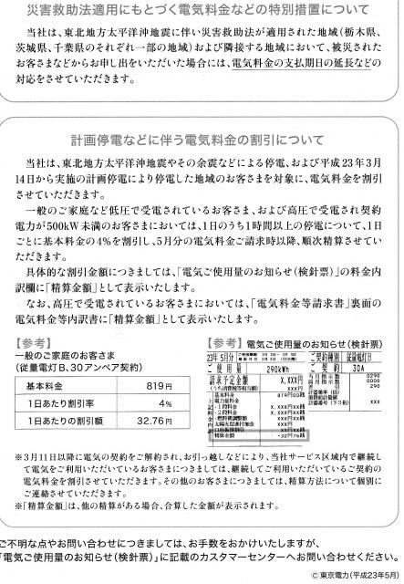 計画停電の実施で、停電した地域の利用者を対象に、5月分の基本料金を一律4%割引きされています。