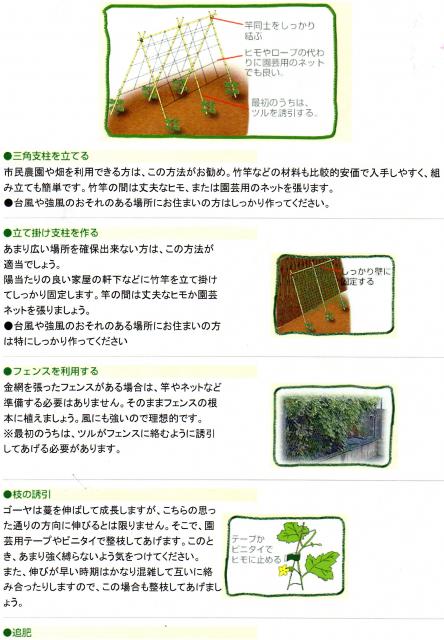 最初は、ツルがよく巻きつくように、ツルをネットに軽く留めてあげましょう。