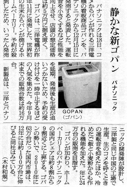 家電 2011年10月19日パナソニック傘下で事業の再編を進める三洋電機の人気商品の米粒からパンが焼ける「GOPAN(ゴパン)」の新機種がパナソニックから発売されることになりました。
