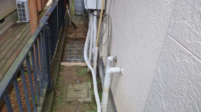 エコキュートのタンクを置く場所の土を掘り起こし転圧し、家の基礎と鉄筋を合わせ地震に強い基礎を作ります。