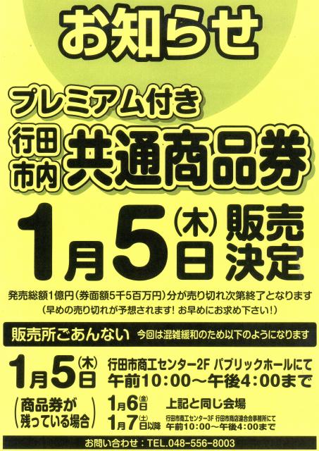 来年1月5日(木)に行田市内のお店で使える、「プレミアム付き共通商品券」が発売されます!!