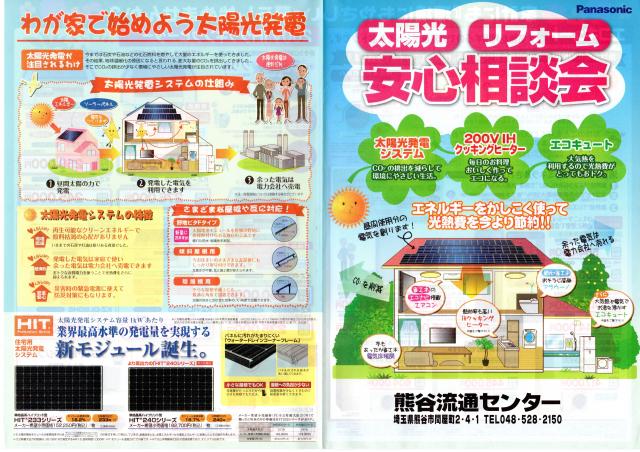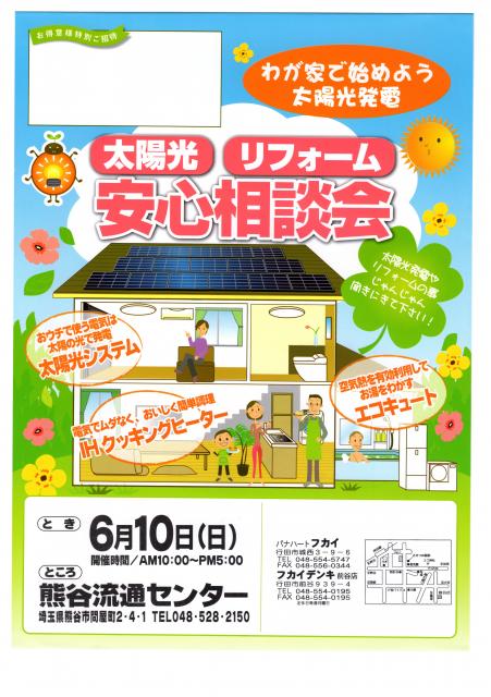 既にお手元にお届きかと思いますが、今度の日曜日に熊谷流通センターにて、太陽光・リフォーム安心相談会を開催します。