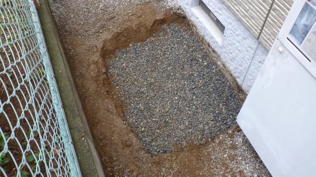 タンクの設置位置の土を掘り起こし転圧後、砂利を敷き詰めます。